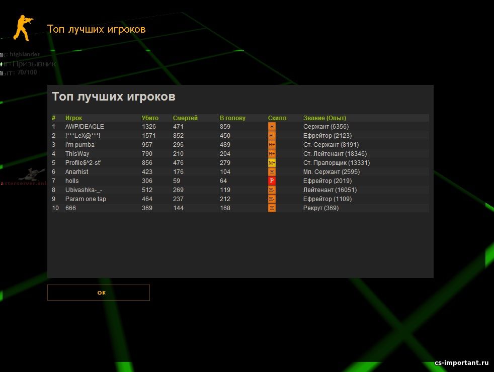 Новый плагин статистики StatsX с поддержкой AES и CSstatsX SQL. Скопирован один из дизайнов Army Ranks StatsX, добавлены формулы расчета K:D, процента убийств в голову, скилла на основе эффективности, добавлен топ текущих игроков на сервере. С помощью кваров можно полностью перенастроить формирование мотд окн и сообщений. |
